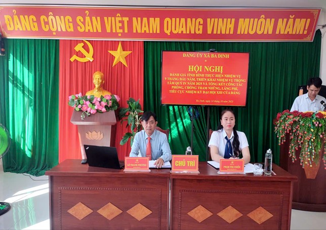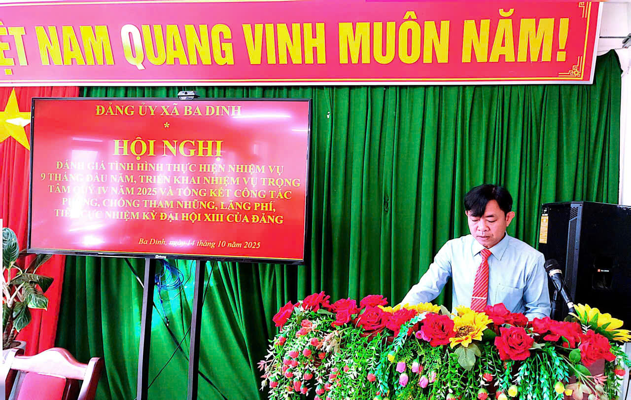 Sáng ngày 14/10/2025, tại Hội trường Đảng ủy xã Ba Dinh (thôn Nước Lô), Ban Thường vụ Đảng ủy xã Ba Dinh tổ chức Hội nghị đánh giá tình hình thực hiện nhiệm vụ 9 tháng đầu năm, xác định nhiệm vụ trọng tâm quý IV năm 2025 và tổng kết công tác phòng, chống tham nhũng, lãng phí, tiêu cực nhiệm kỳ Đại hội XIII của Đảng. Đồng thời triển khai thực hiện Quy định số 339-QĐ/TW ngày 10/7/2025 của Ban Bí thư về sử dụng ứng dụng “Sổ tay đảng viên điện tử” và Kế hoạch số 07-KH/TU ngày 13/10/2025 của Tỉnh ủy Quảng Ngãi về triển khai ứng dụng Sổ tay đảng viên điện tử và Chỉ thị số 02-CT/TU ngày 06/10/2025 của Tỉnh ủy Quảng Ngãi về nâng cao hiệu quả phong trào thi đua “Dân vận khéo” trên địa bàn tỉnh.