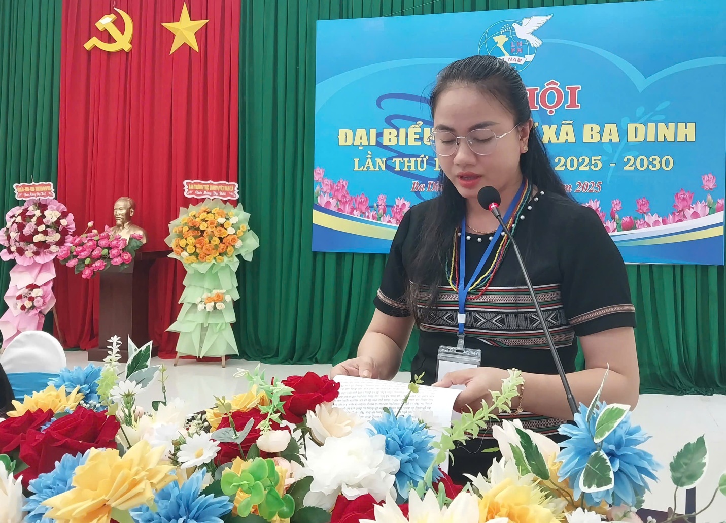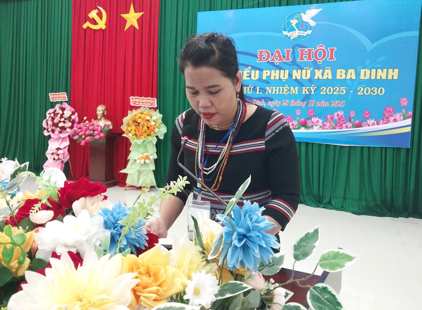 Phát biểu khai mạc Đại hội, đồng chí Phạm Thị Lin, Phó Chủ tịch Ủy ban MTTQ Việt Nam, Chủ tịch Hội Liên hiệp phụ nữ xã Ba Dinh đã nêu rõ: Đại hội đại biểu Phụ nữ xã Ba Dinh lần thứ I, nhiệm kỳ 2025-2030 có ý nghĩa quan trọng, đánh dấu bước chuyển mới của phong trào phụ nữ và hoạt động Hội phụ nữ xã. Đại hội có nhiệm vụ tổng kết, đánh giá toàn diện, khách quan kết quả thực hiện Nghị quyết Đại hội đại biểu phụ nữ nhiệm kỳ 2021 – 2026; nghiêm túc chỉ ra những tồn tại, hạn chế, rút ra bài học kinh nghiệm; xác định mục tiêu và giải pháp cho nhiệm kỳ 2025 – 2030; kiểm điểm sự lãnh đạo của Ban Chấp hành Hội Liên hiệp phụ nữ xã nhiệm kỳ 2021 – 2026; thảo luận đóng góp ý kiến vào dự thảo văn kiện của Đại hội đại biểu Phụ nữ toàn quốc lần thứ XIV và dự thảo báo cáo Đại hội đại biểu Phụ nữ tỉnh Quảng Ngãi lần thứ I, nhiệm kỳ 2025 – 2030.