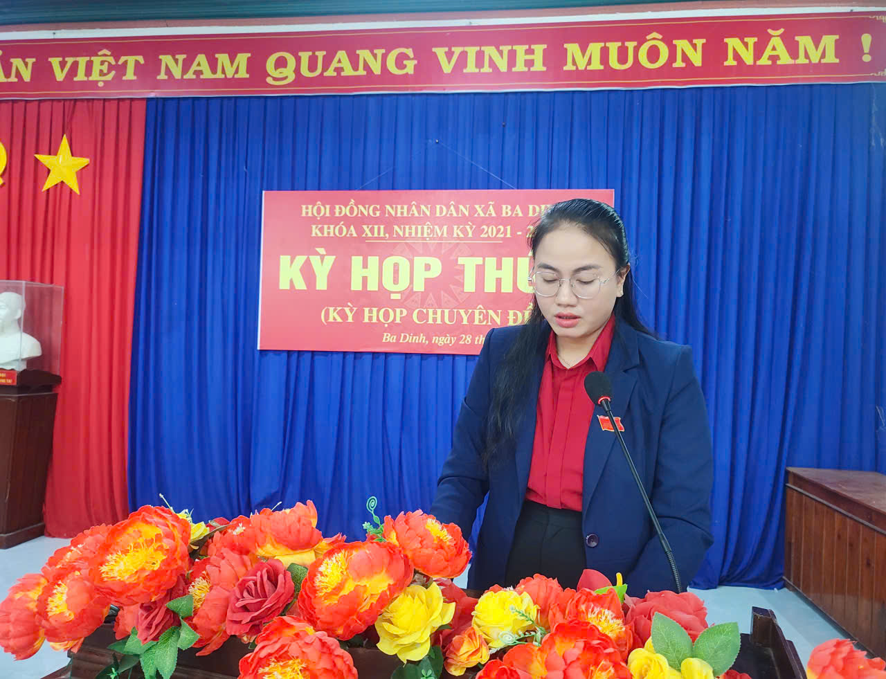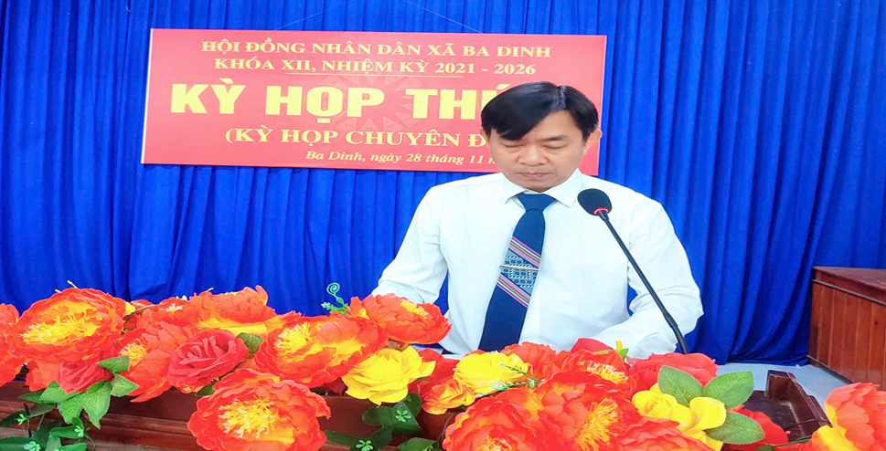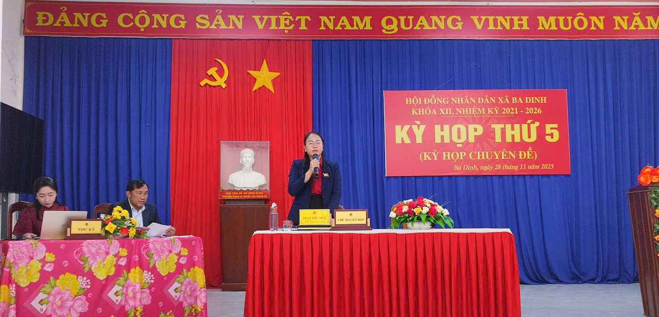 Sáng ngày 28/11/2025, tại Nhà văn hóa UBND xã Ba Dinh, HĐND xã tổ chức kỳ họp thứ 5 (Kỳ họp chuyên đề) HĐND xã khóa XII nhiệm kỳ 2021 – 2026. Chủ trì kỳ họp đồng chí Phạm Thị Chiến, Phó Bí thư Thường trực Đảng ủy xã, Chủ tịch HĐND xã; dự kỳ họp có đồng chí Lê Thanh Phương, Bí thư Đảng ủy xã, các đồng chí: Đinh Quang Trung, Phạm Văn Nhung - Phó Chủ tịch UBND xã; đại diện Uỷ ban MTTQ Việt Nam xã; Trưởng, Phó các Ban Hội đồng nhân dân xã; Đại biểu HĐND xã khoá XII, cùng đại diện lãnh đạo các Phòng: Kinh tế, Văn hóa – Xã hội và Chánh, Phó chánh Văn phòng HĐND&UBND xã.