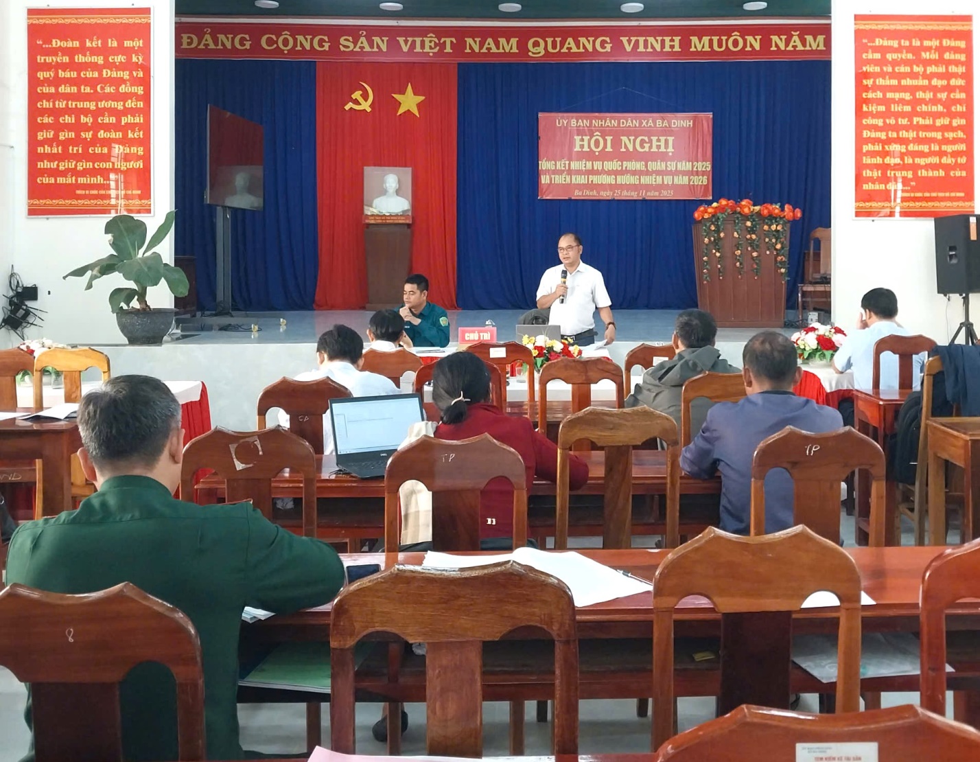 Sáng ngày 25/11/2205, Uỷ ban nhân xã Ba Dinh tổ chức Hội nghị tổng kết công tác quân sự, quốc phòng năm 2025 và triển khai nhiệm vụ năm 2026 do đồng chí Phạm Văn Ôn, Chủ tịch Uỷ ban nhân xã; đồng chí Phạm Văn Vót, Ủy viên Ban Thường vụ Đảng ủy, Chỉ huy trưởng Ban Chỉ huy Quân sự xã, đồng chủ trì hội nghị. Dự hội nghị có đồng chí Lê Thanh Phương, Bí thư Đảng ủy xã; đồng chí Phạm Công Sự Chủ tịch Ủy ban Mặt trận Tổ quốc Việt Nam xã; các đồng chí Trưởng, Phó các ban ngành và Thôn trưởng các thôn tham dự Hội nghị.