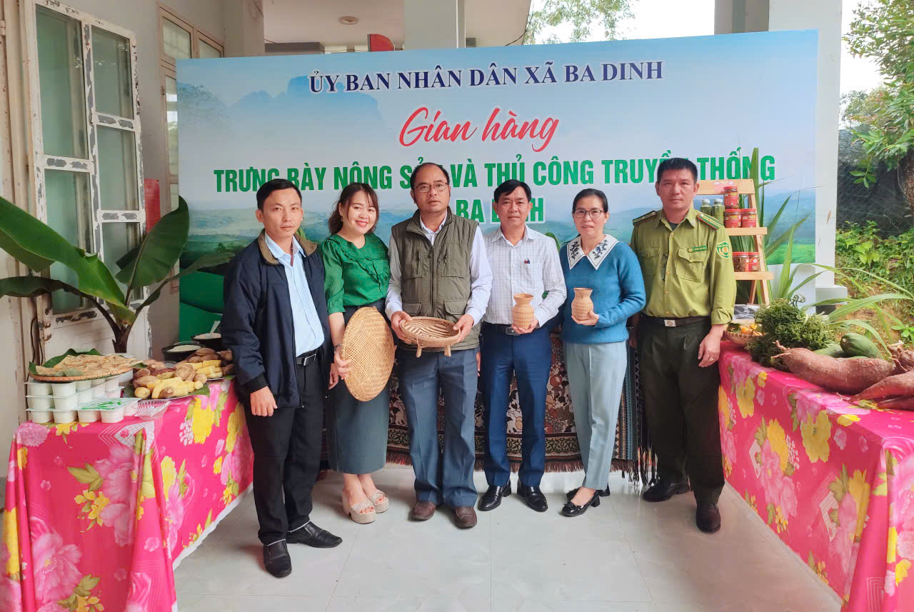 Lãnh đạo xã chụp ảnh kỷ niệm tại gian hàng trưng bày sản phẩm nông nghiệp và các mặt hàng thủ công truyền thống của địa phương.