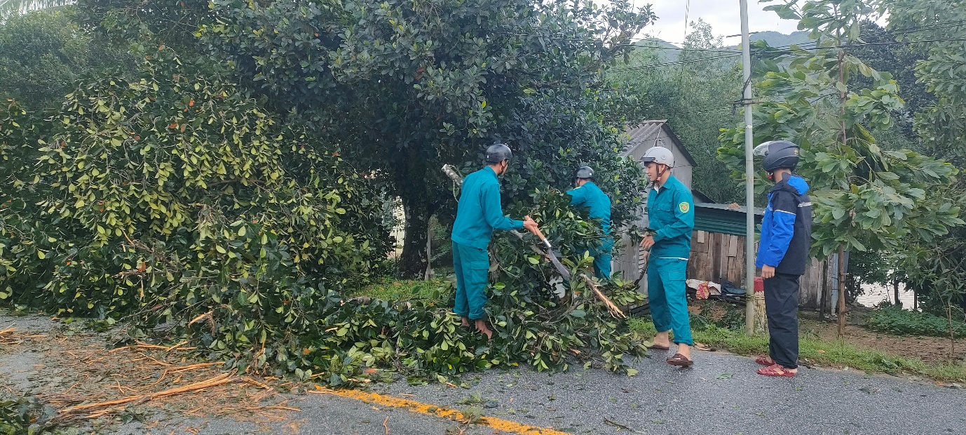 Tại các tuyến đường liên thôn và Quốc lộ 24 đã bị cây cối ngã đổ ra đường, gây mất an toàn giao thông. Để đảm bảo lưu thông ở các tuyến đường. Đồng chí Chủ tịch Ủy ban nhân xã đã chỉ đạo lực lượng dân quân và Công an xã, cắt dọn các cây bị ngã đổ đảm bảo giao thông thông suốt.