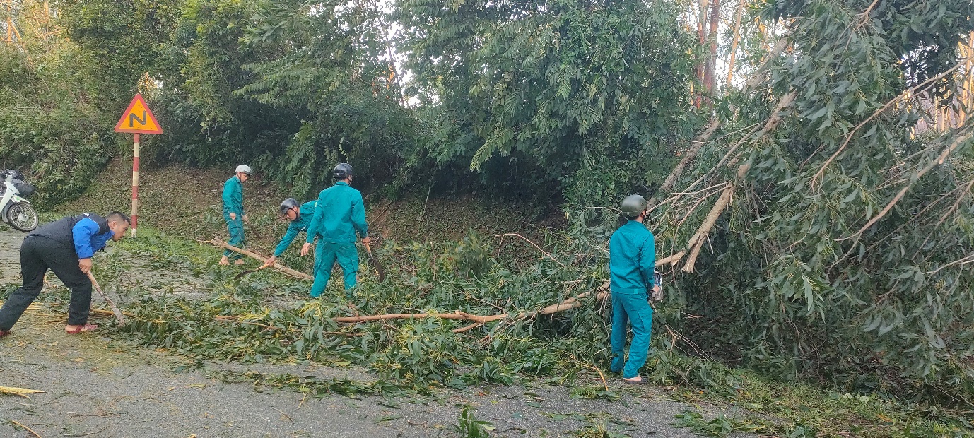 Lực lượng dân quân cắt dọn cây cối ngã đổ trên tuyến Quốc lộ 24