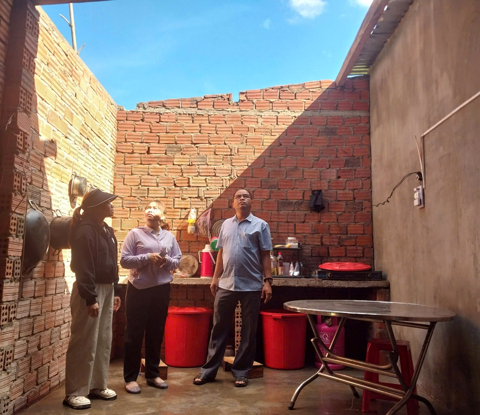 Đồng chí Phạm Văn Ôn, Phó Bí thư Đảng ủy - Chủ tịch Ủy ban nhân xã kiểm tra nhà hộ dân Phạm Thị Bình thôn Nước Lang bị tốc mái