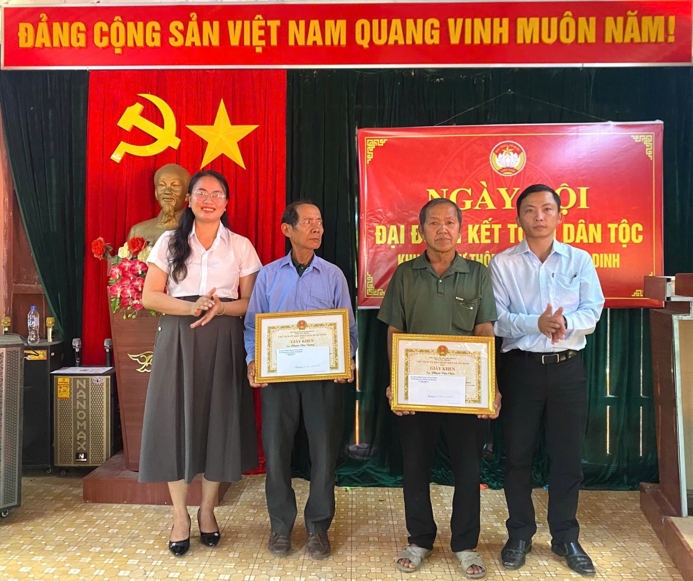 Đồng chí Phạm Thị Chiến, Phó Bí thư Đảng ủy – Chủ tịch HĐND xã và đồng chí Đinh Quang Trung, Phó Chủ tịch UBND xã tặng Giấy khen cho hộ gia đình đạt gia đình văn hóa tiêu biểu và quà cho hộ dân có hoàn cảnh khó khăn